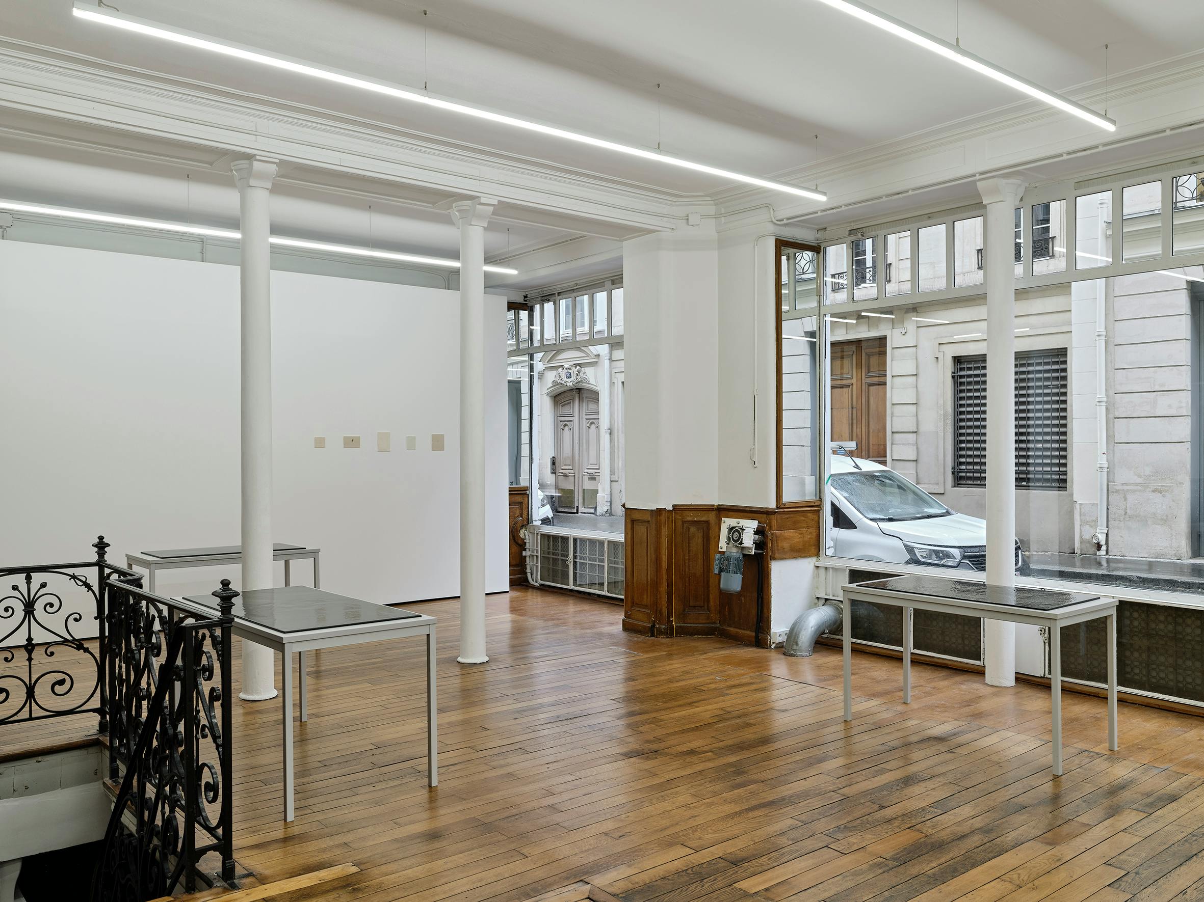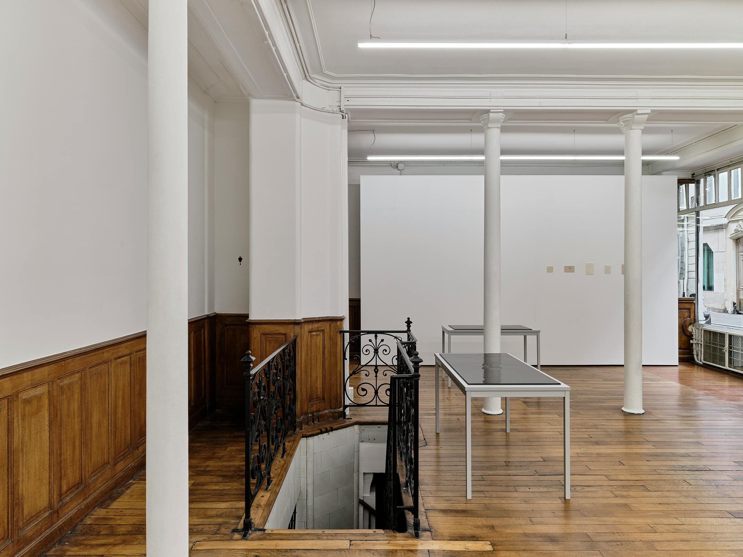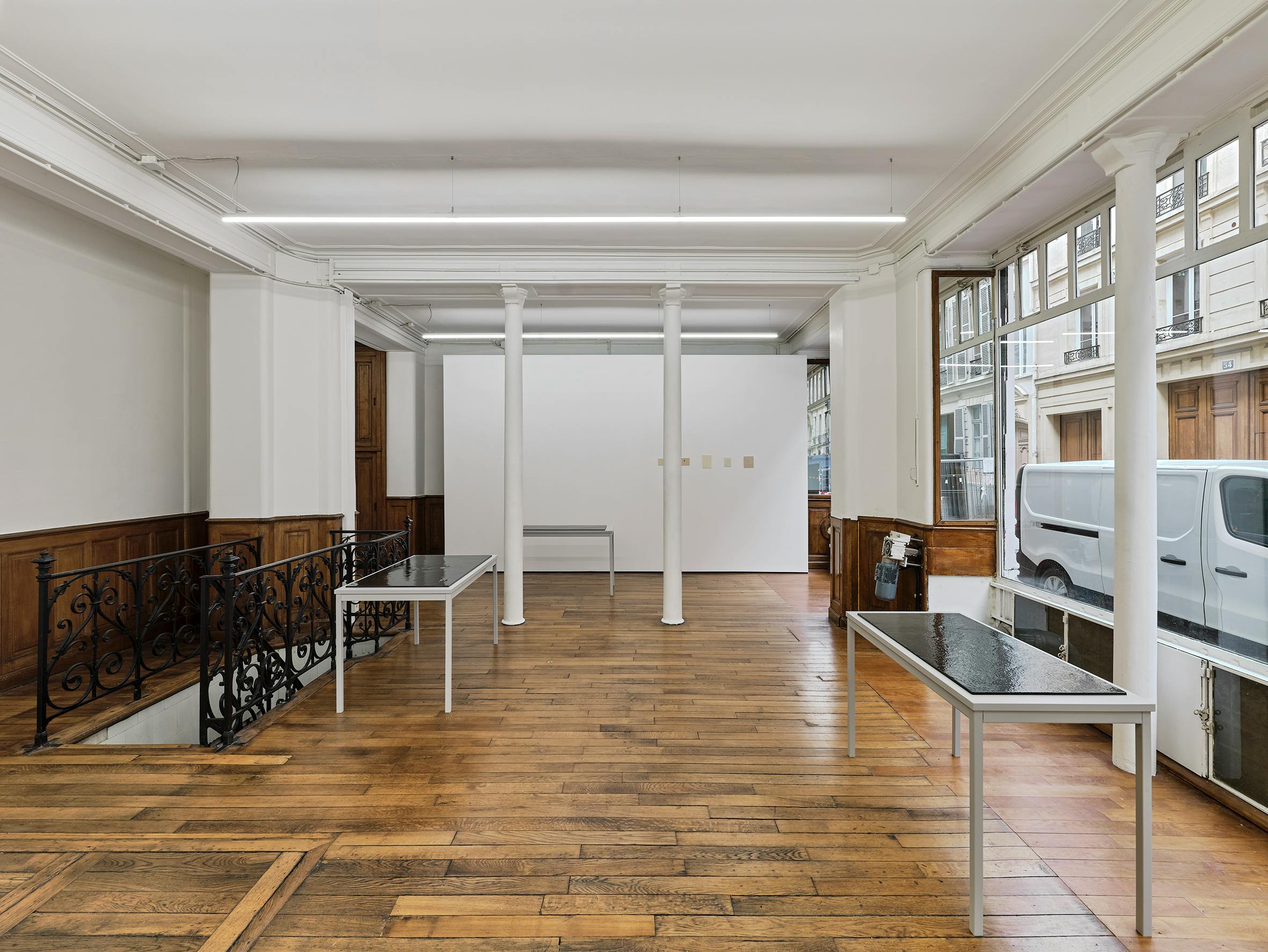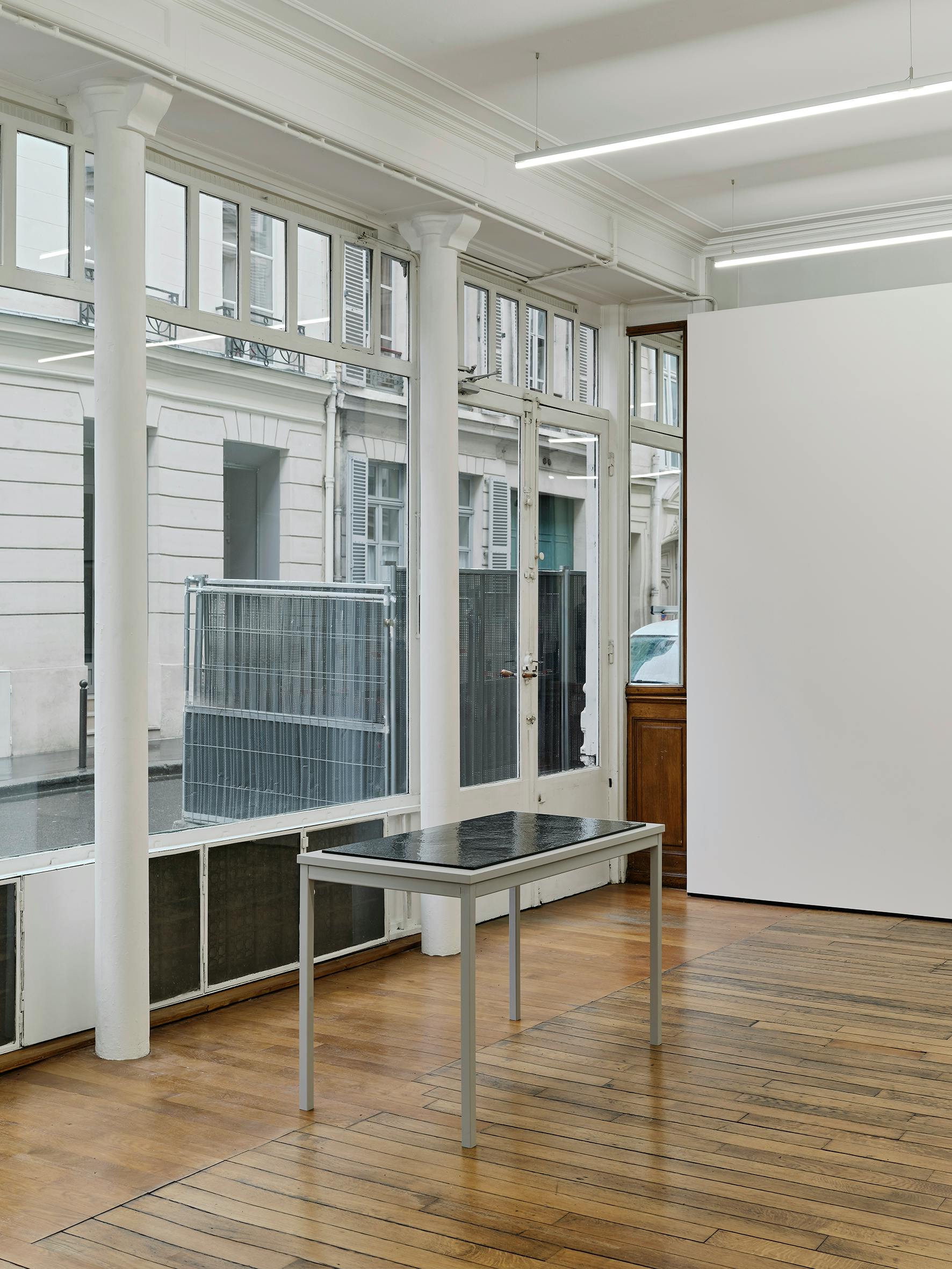 Pierre Allain’s work ensconces a muteness that holds within it an expanse, that articulates through subterranean vocalizations (like the murmuring of speaking under one’s breath, and speaking within one’s mind). Regulated like breathwork, through variant speeds, sometimes collating, sometimes shuttling, sometimes doubling, sometimes cancelling out. Between intertwinement and contradiction, between the container and the contained. Hot breath on a cold object that transforms and vanishes. The forever record of a brief touch. A halting susurration. See-through bodies and see-through histories. A trio of receptive corpus: a pair of steel tables and a larger third, recalling administration and those used in laboratories and the pharmaceutical industry, each supports a steel sheet coated with sound dampening material that reduces reverberation. These horizontal substrates are further coated with glossy black paint that absorbs while reflecting light.