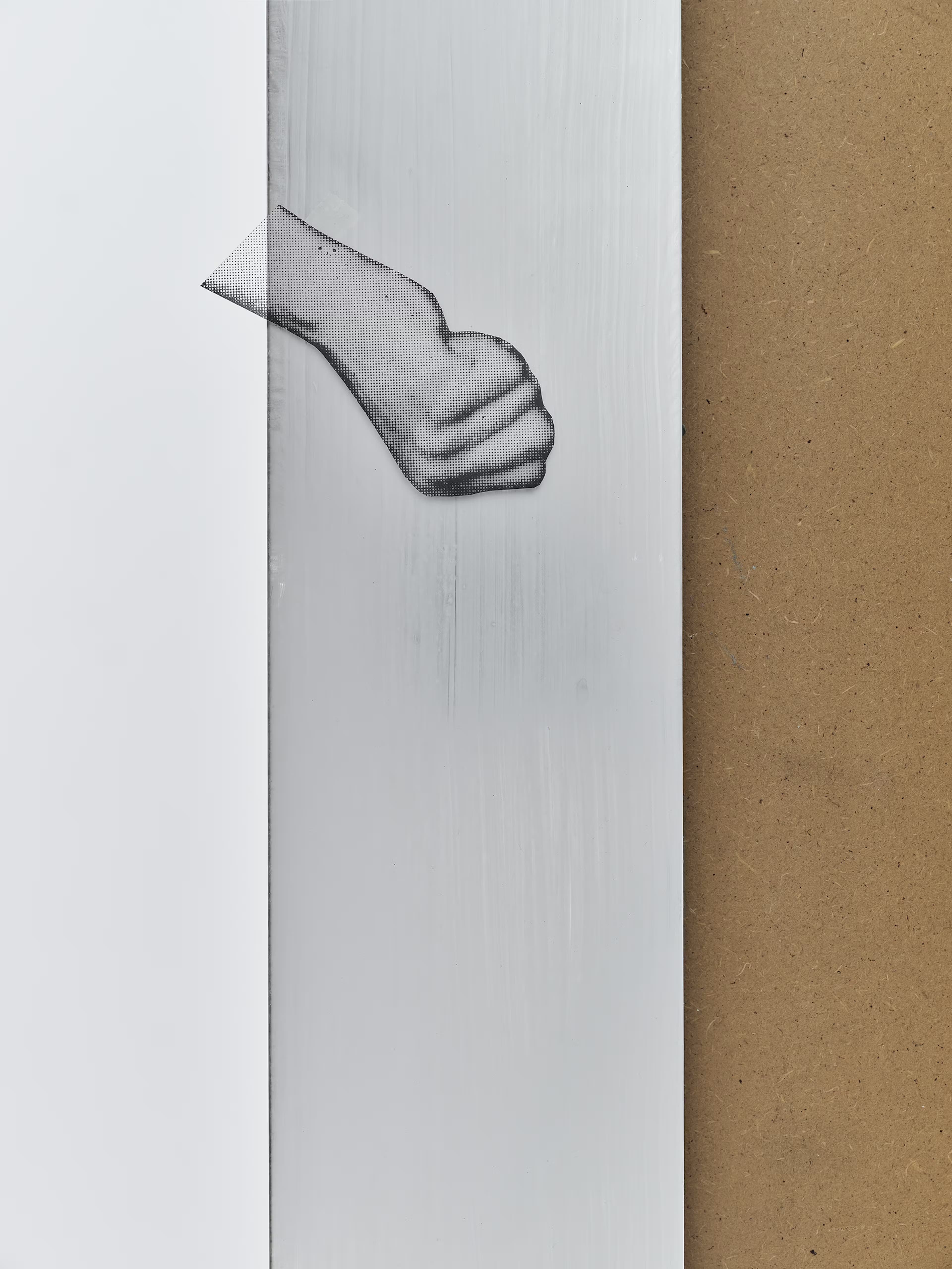 MDF wood previously used as a table to sculpt clay, traces of clay, patinated mirrors, inkjet prints on film, tape, air- dry porcelain