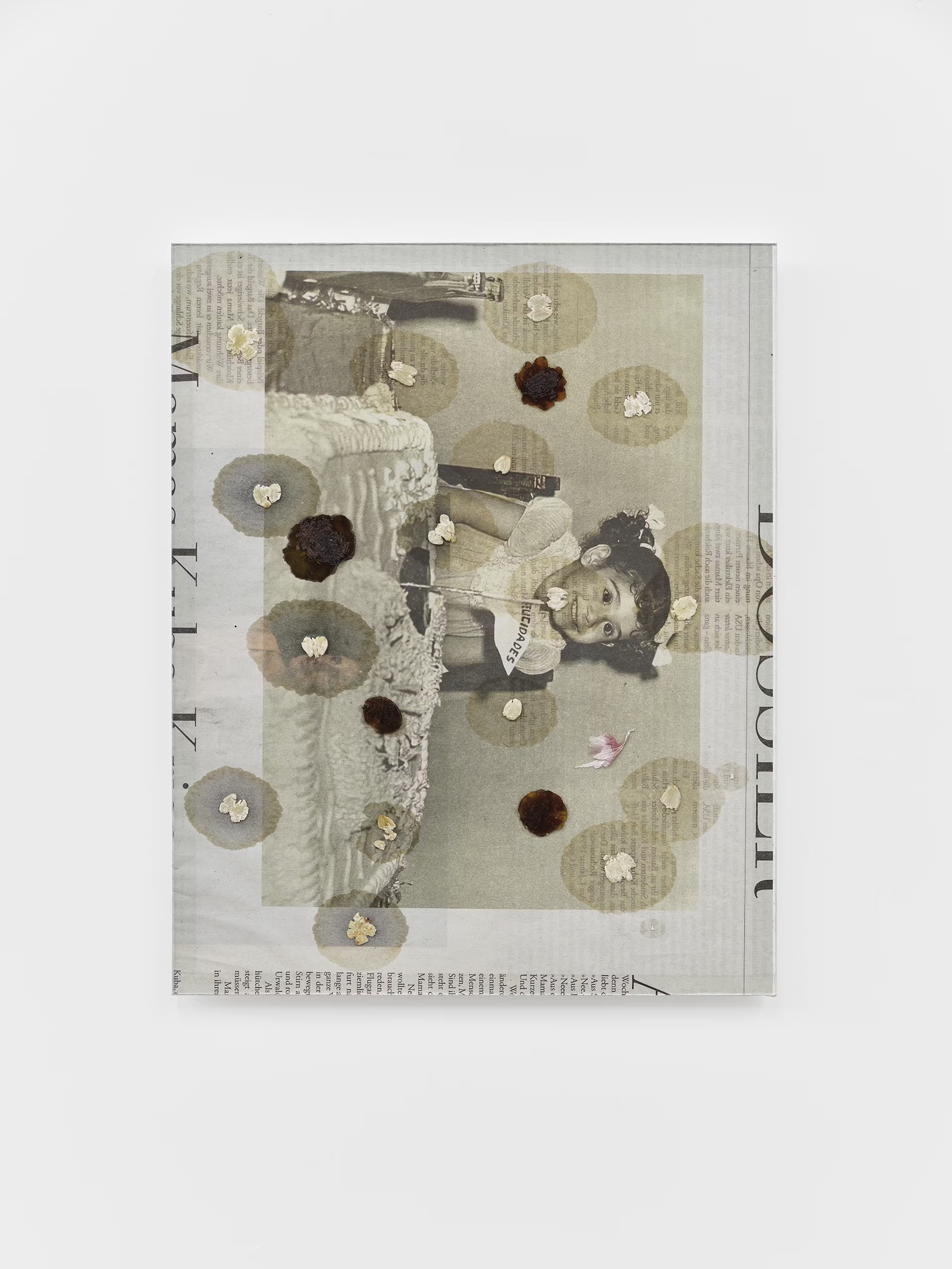 pine nuts, raisins and garlic peel on newspaper (Die Zeit, December 19, 2024), Artglass AR 99 Water White, acid-free board, tape on Dibond
