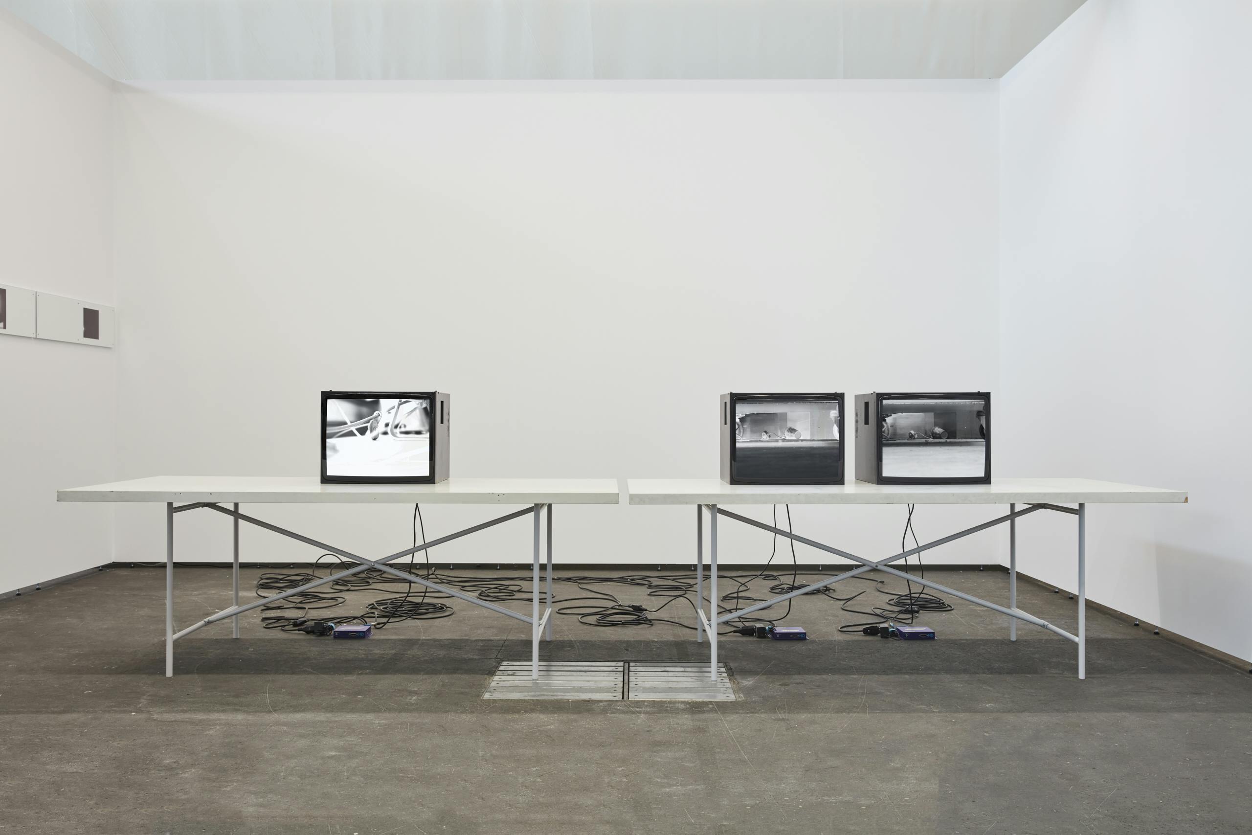 Lenard Giller is developing a practice which explores and collapses the life-spans of time-based technologies and their two-way translations into language, memory and perception. Adaptations (2023) follows recent video-works made by the artist over the course of the past year. These previous works are characterised by static recordings and precise assemblage of found and recorded material—drawn from popular culture or the everyday languages of mass-media—along predefined timelines. The works and their technical realization mirror one another: digital or analogue footage is displayed according to their historical containers or material necessities.